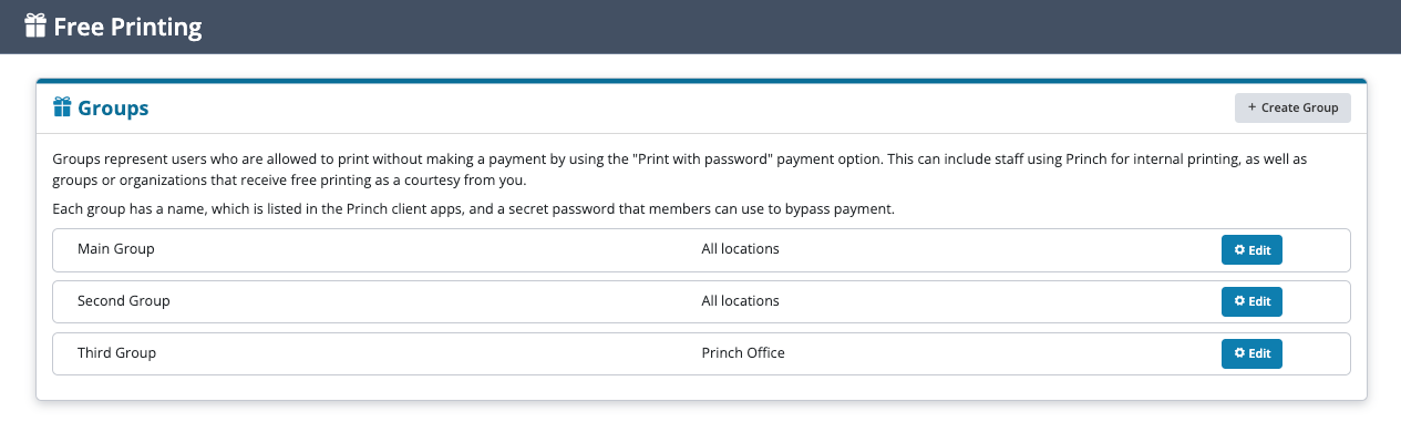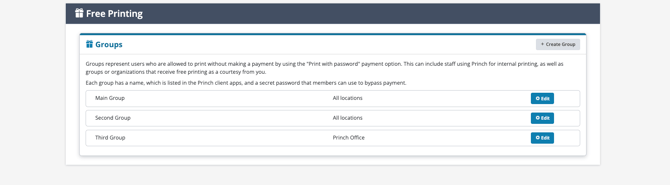 Manage which users can print without payment by creating and editing groups in the Princh Administration Panel.